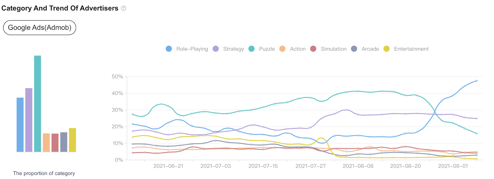 The regulatory policy on mobile games is relatively loose in Hong Kong, Macao and Taiwan, and overall wifi deployment is rather friendly to downloading games. Various types of games can be accepted by players in these regions. According to media buying data captured by SocialPeta from Google Ads within the last 6 months, the top categories of advertisers are role-playing, puzzle, and strategy games.