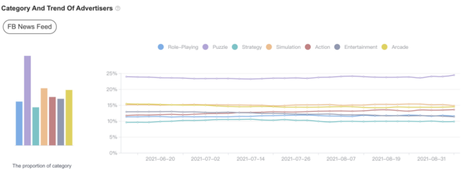 With only 39.2M smartphone users, South Korea didn't enter the top, but did have a 76.5% smartphone penetration rate back in 2020, and people enjoy playing games here. From SocialPeta's media buying data of mobile games on Google Ads, we can see that categories of active advertisers show little change within the last 3 months, and puzzle games are the most popular in South Korea.